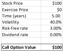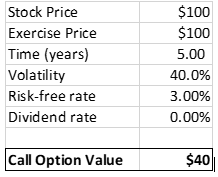 Having talked to management and studied comparable companies, I know the term is five years, volatility is 40%, RFR is 3%, and dividend rate is 0%. Putting these six inputs into the BSOPM results in the following: