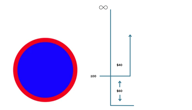 2) Negatively define a space. How do we calculate the fair value per preferred unit? In the chart below, if I drew the blue circle inside the red circle, you might be challenged to tell me what the area of the red space is. We don’t have a convenient formula to calculate the area of a donut and we don’t have a convenient formula to calculate the value of distributions of up to $100 for XYZ Co. However, if I gave you the radius of the red and blue circles, you could calculate the area of the red circle less the blue circle and thus, calculate the area of the red space. We know that the values of a call option on XYZ Co. with a strike price of $0 and $100 are $100 and $40, respectively. Using our geometry, we can calculate the fair value of a preferred unit to be $0.60 (($100 - $40) / 100). This is referred to as a call option spread and is illustrated below.